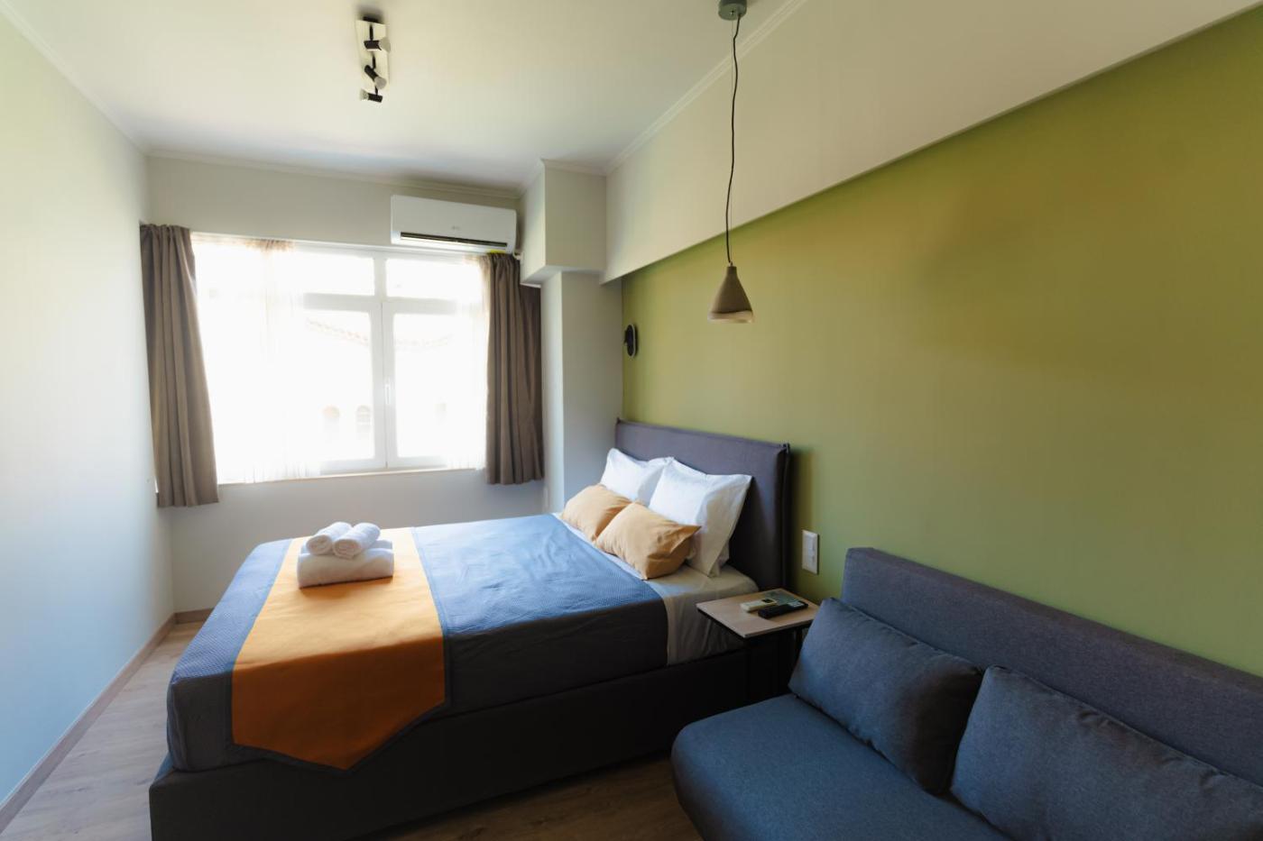 One-Bedroom Apartment. The air-conditioned apartment features 1 bedroom and 1 bathroom with a shower and a hairdryer. The well-fitted kitchenette has a stovetop, a refrigerator, kitchenware and a microwave. The apartment offers soundproof walls, a tea and coffee maker, a sofa, a flat-screen TV with streaming services, as well as city views. The unit offers 1 bed.