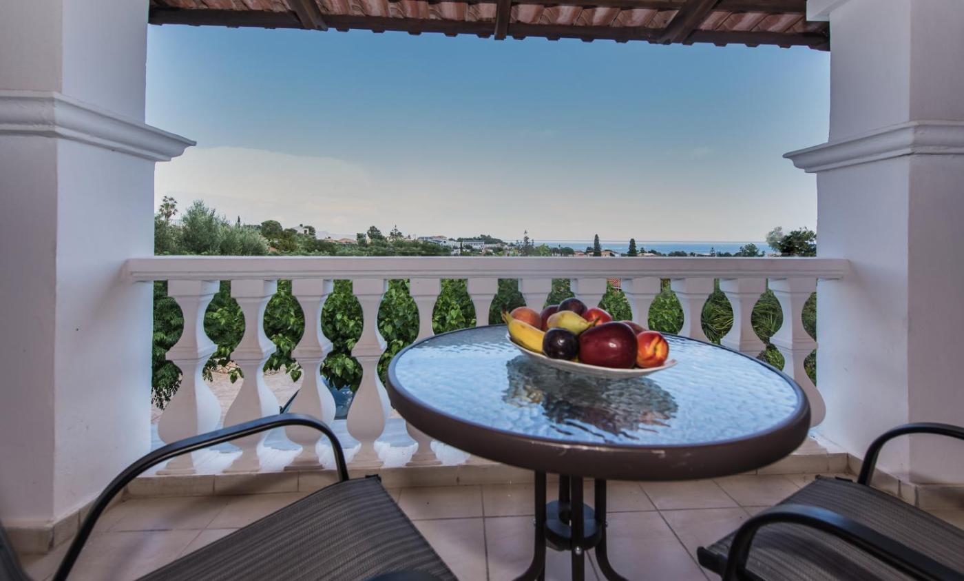 Studio. Bright and air conditioned, this studio opens to a spacious, furnished balcony with mountain or Ionian Sea views. It has a kitchenette with a fridge, mini oven with cooking rings and dining table. Free Wi-Fi, TV and air-conditioned is provided. ;